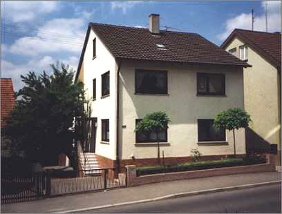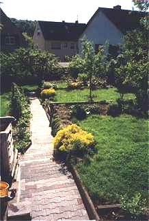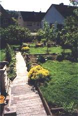 Auf den zwei Bildern sieht man unseren Garten und den hinteren Teil des Hauses, der 1990 an das alte Haus angebaut wurde. Der Garten besitzt ein paar Rasenflächen, auf dem die Kinder früher spielten.