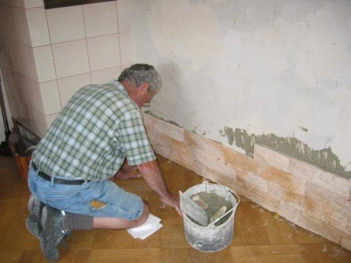 Also haben wir alles Material besorgt und zusammen mit Ewald losgelegt. Das Abtapezieren habe ich bereits letzten Sonntag angefangen und Rolf & Ewald haben am Montag dann die restlichen Tapeten von den Wänden und der Decke weggemacht. Als nächstes haben sie den Stuckrand